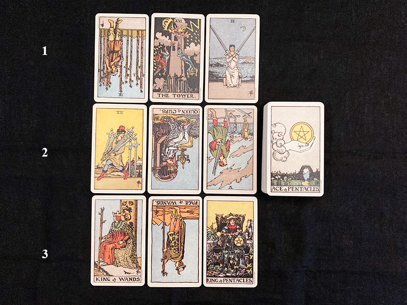 You have the Tower in the middle of the spread, which suggests you might be thinking about doing something unusual—like visiting places you don’t normally go to, such as a club, a haunted house, or districts you’ve never visited before.