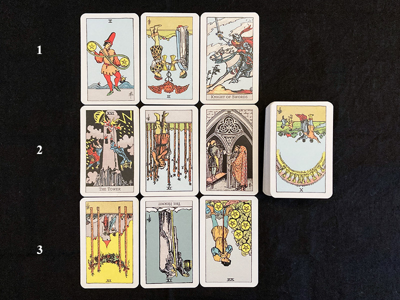 You have the Two of Cups reversed in the middle, so I think this is talking about work-life balance and responsibility.