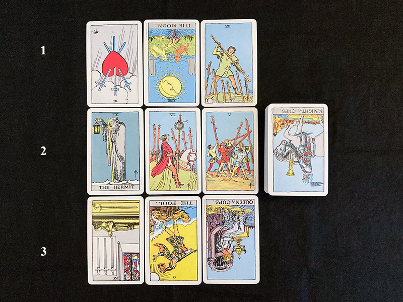 We have the Knight of Cups reversed at the bottom of the deck, followed by the Three of Cups reversed.