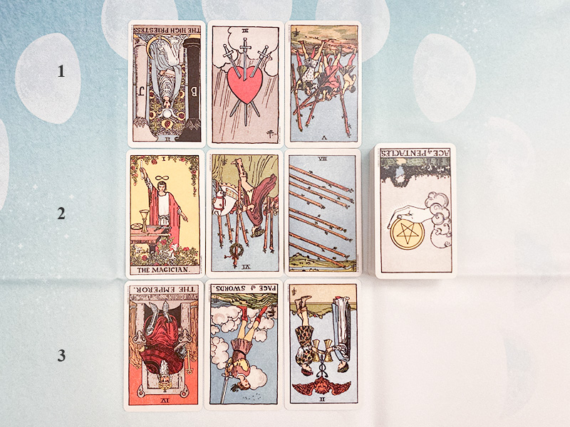 You have the High Priestess in reverse as the first card, so you may be very intuitive, but perhaps doubting your intuition or the choices you’ve made based on it. You might also be finding it difficult to align with the Moon’s phases or your natural biorhythm.